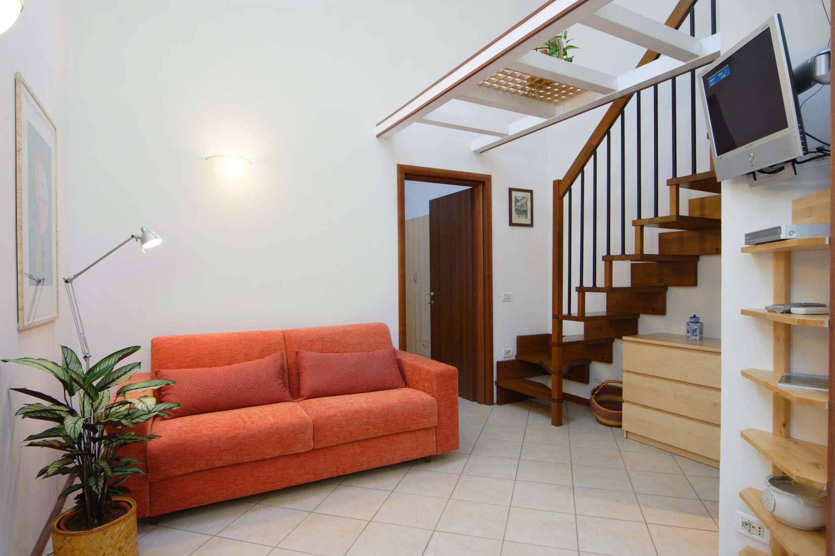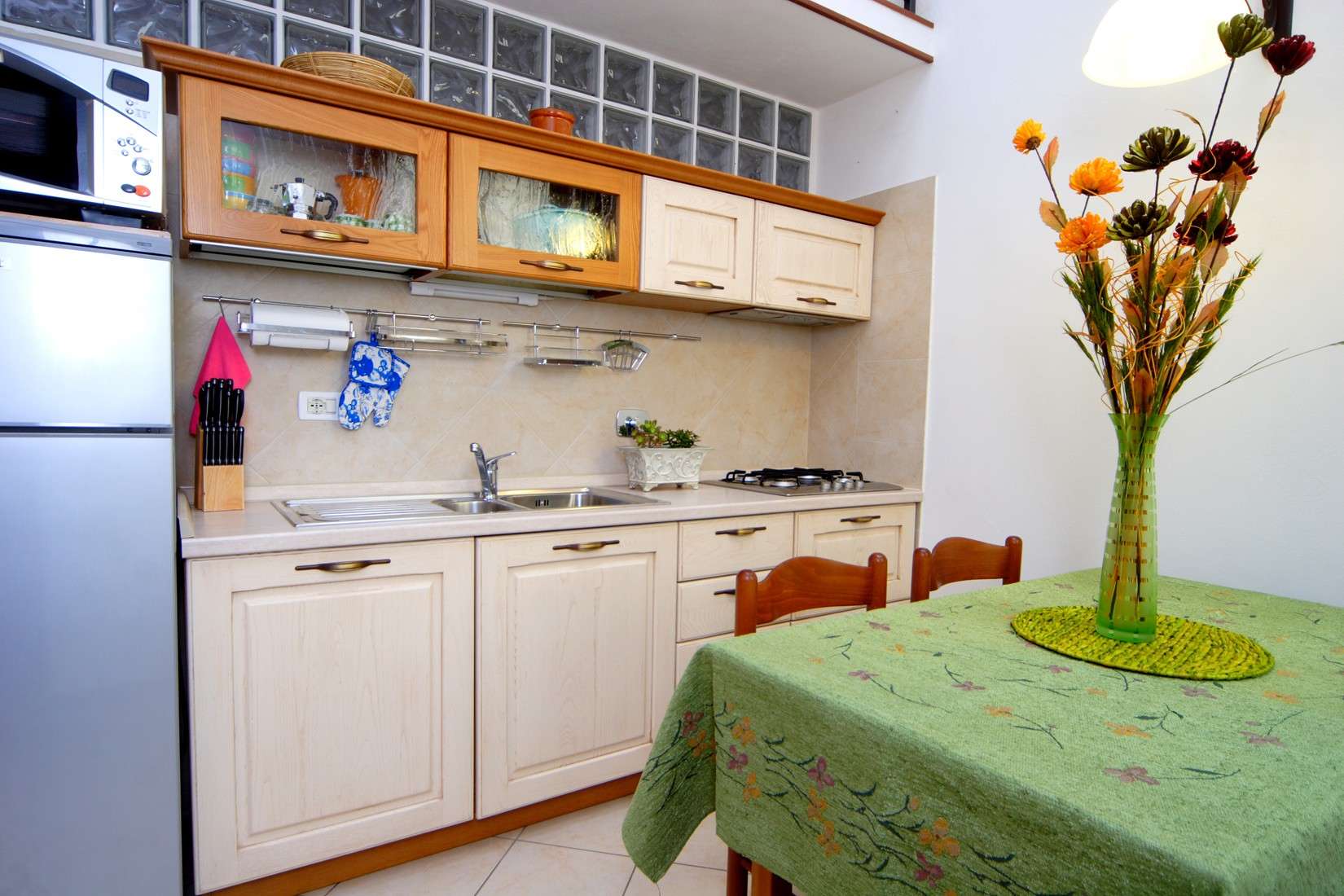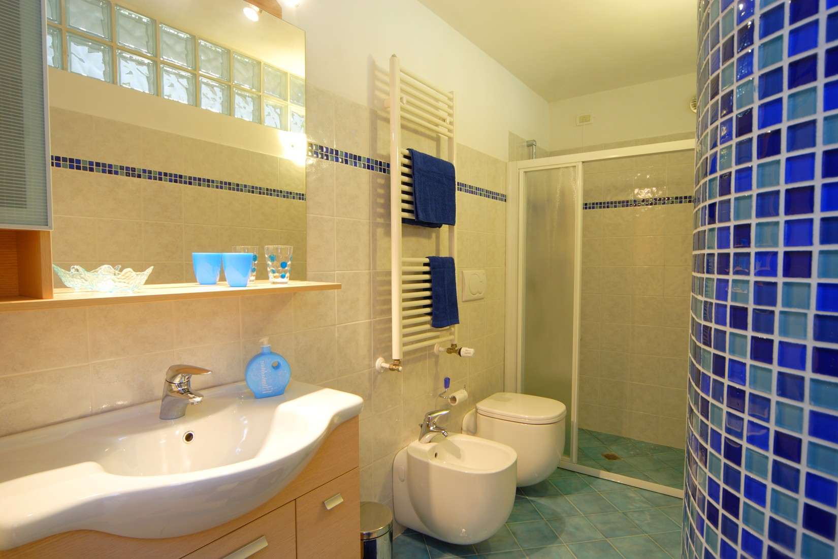 Entering the apartment you will appreciate the spaciousness, comfort and brightness. The ergonomic sofa with a mattress can be easily converted into a bed ready to go for two. The kitchen of highest quality in chestnut wood, complete with every comfort makes it warm and welcoming. The bedroom is equipped with a spacious birch wood wardrobe and is very versatile in the layout of beds ( two single beds, or a double bed ), with the possibility to add an extra bed. There is also a nice and bright relax area with sofa and armchair, perfect for a short rest at the end of the day. A large bathroom with a shower with glass doors and a blue sea ceramic floor, enriches and completes the furnishing of the apartment.