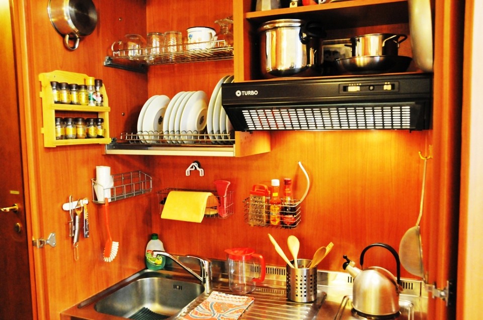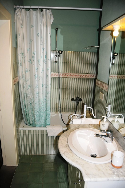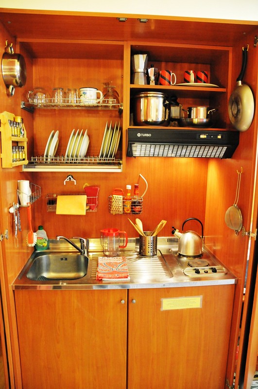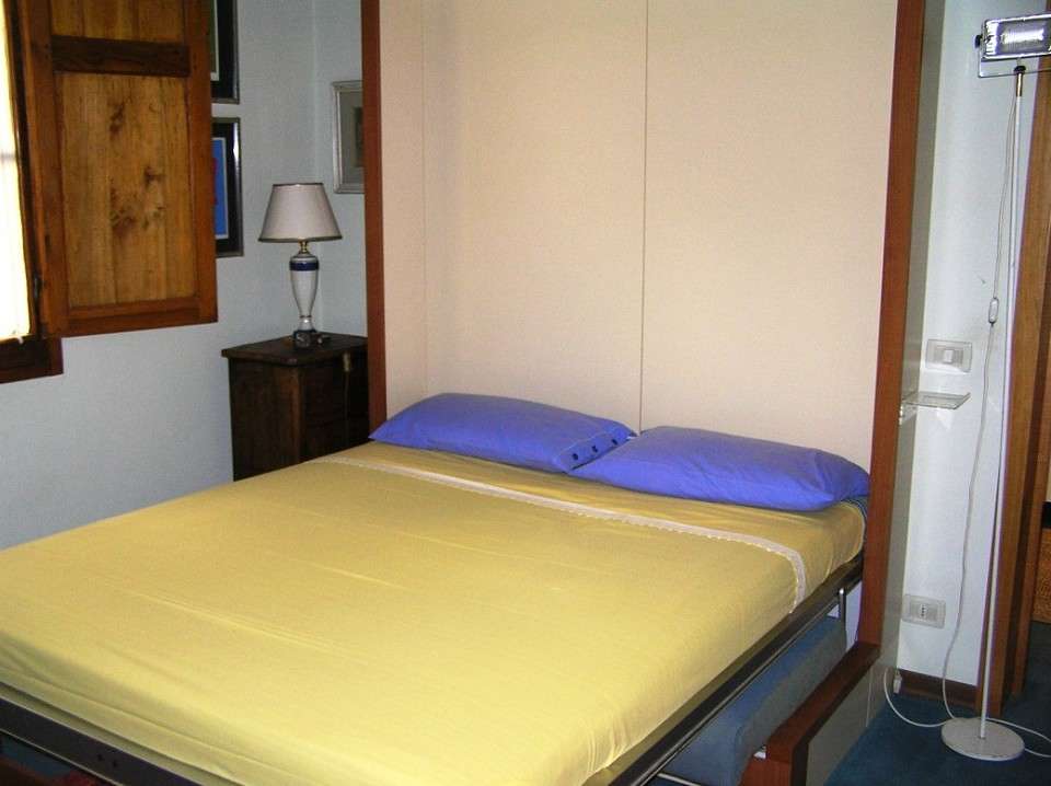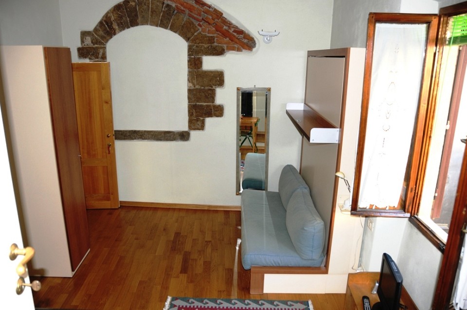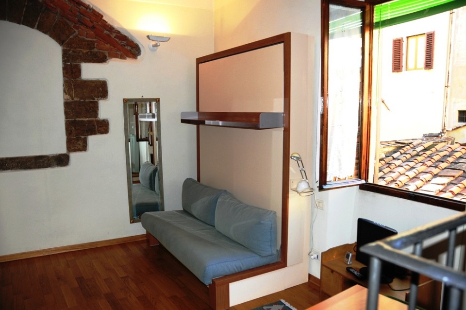 The Giotto apartment is 25 m2 in size, and has a main room with a double murphy bed, table, closet and bookshelf. The kitchenette is complete with all necessary appliances (fridge-freezer, microwave oven, electric hotplates, dishes, American coffee maker, and more).