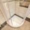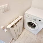 There is a small storage room with washing machine adjacent to the huge brand new contemporary bathroom with shower.