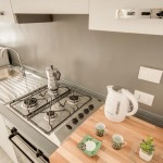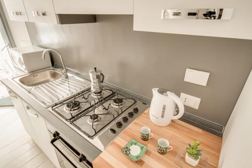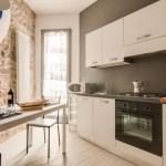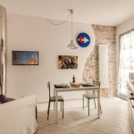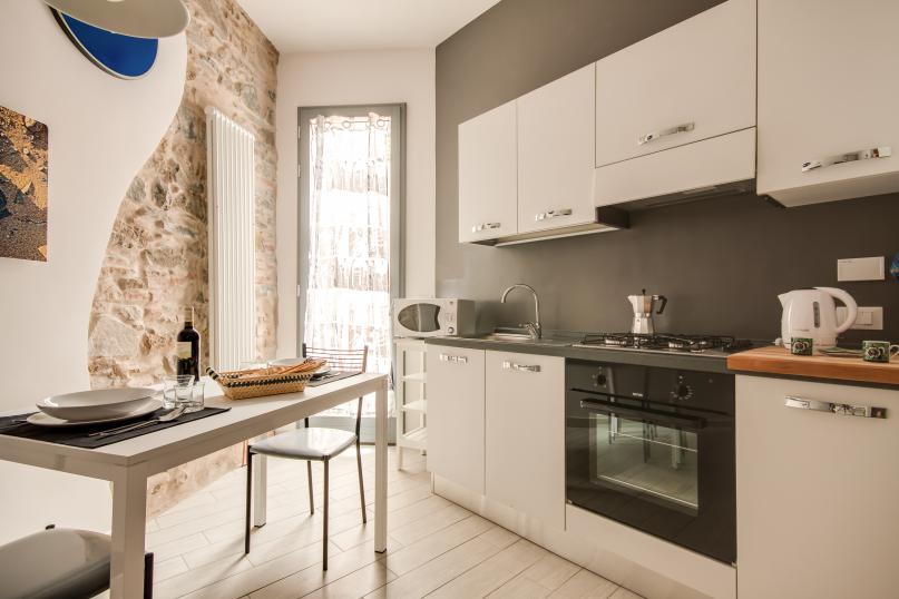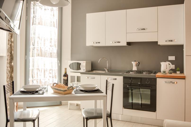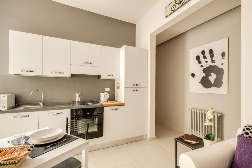 An open space living area provides great space for you to relax and unwind after a long day of Florentine explorations. The living area is furnished with a cozy sofa bed, flat screen TV, dining table and a fully equipped modern kitchen. Exposed bricks in the walls and art works by local street artist CLET add a touch of style and uniqueness.