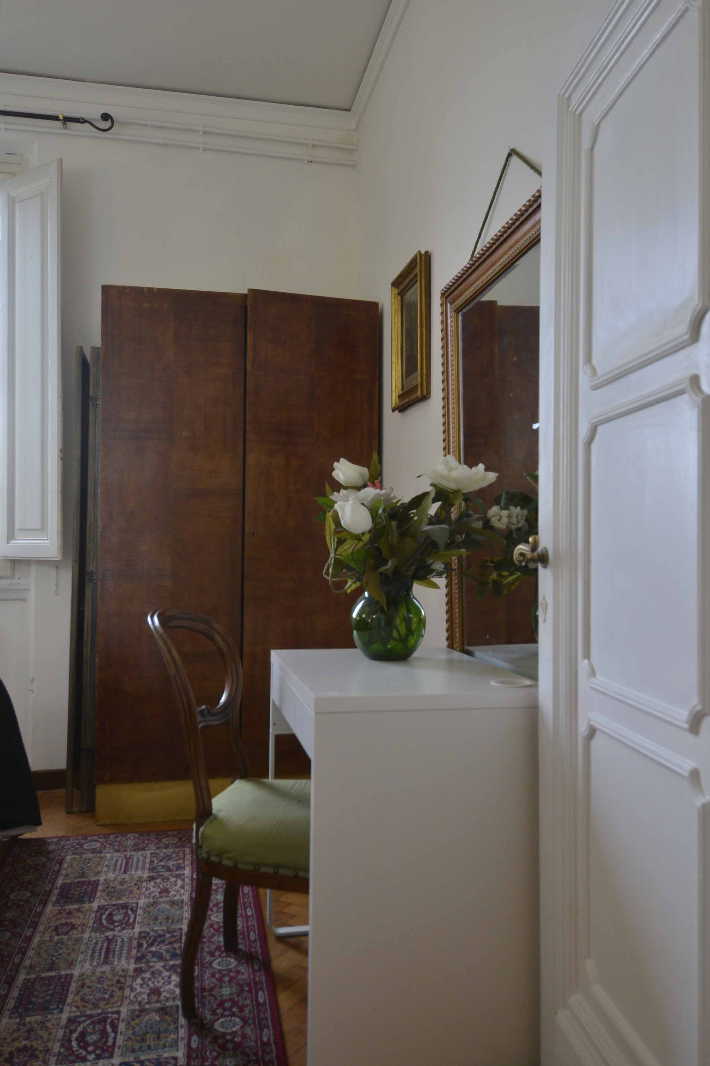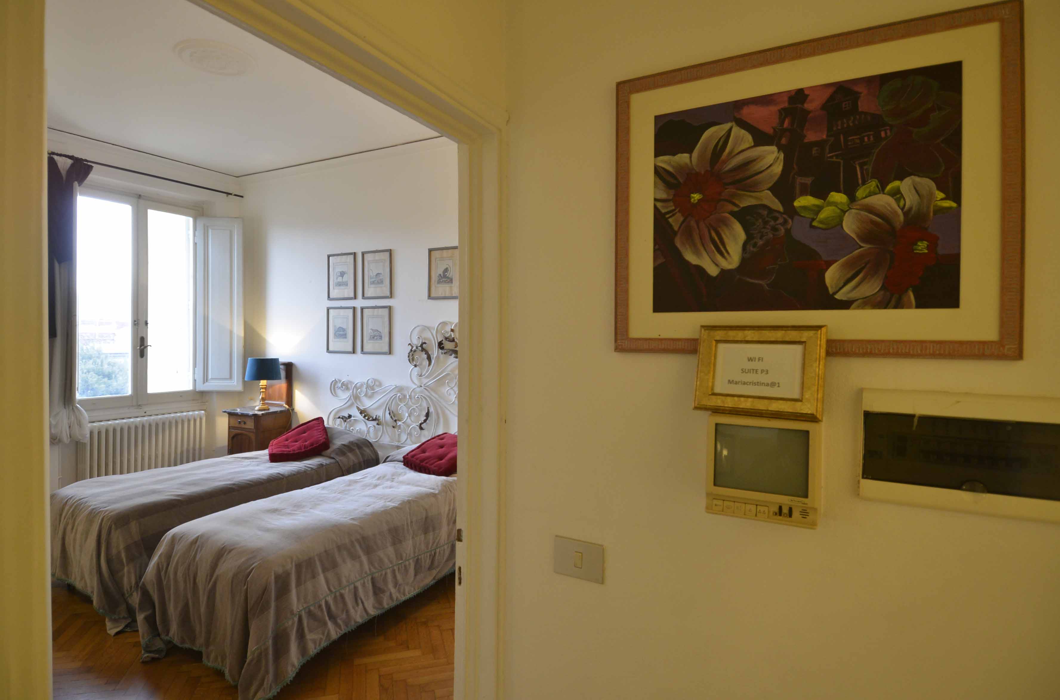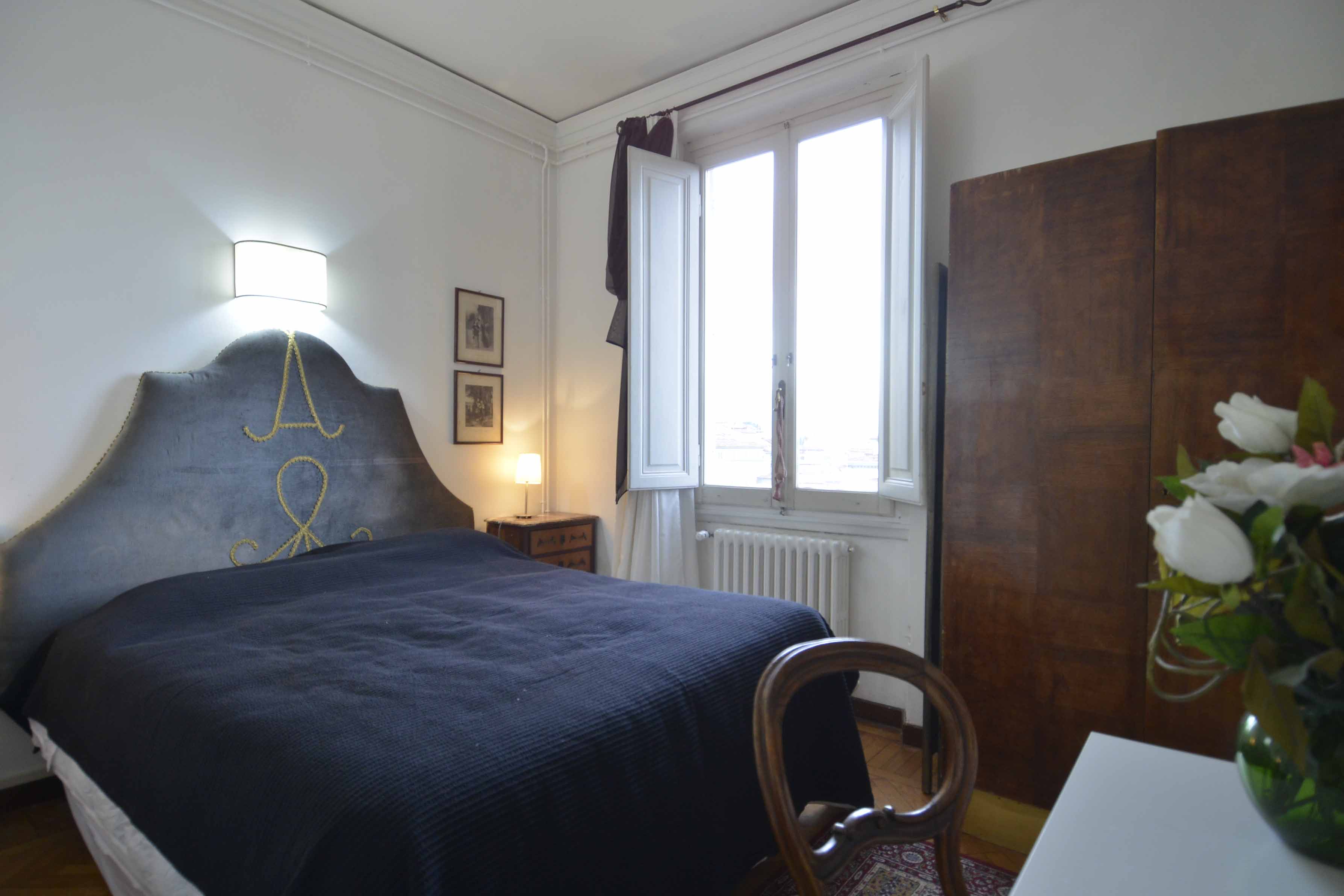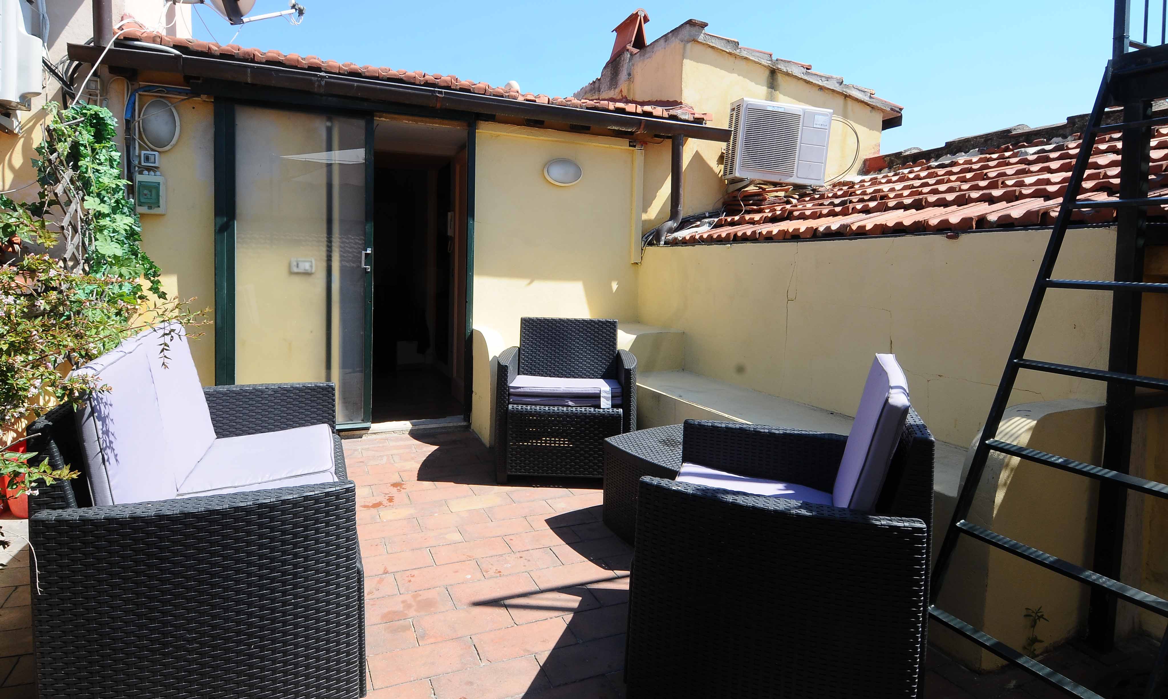 This building comes with several apartments list is coming up shortly and this is the top floor level apartment, cozy and well equipped sleeps 4 people. Three rooms 65 m2 apartment, on the third floor with elevator of the main building, on he very top floor. It consists in a little sitting and dining room with fully equipped kitchen area, large and bright double bedroom with double bed, twin bedroom, 1 bathroom with shower. Very well furnished, parquet, high ceiling, roof terrace in common with another apartment