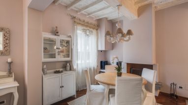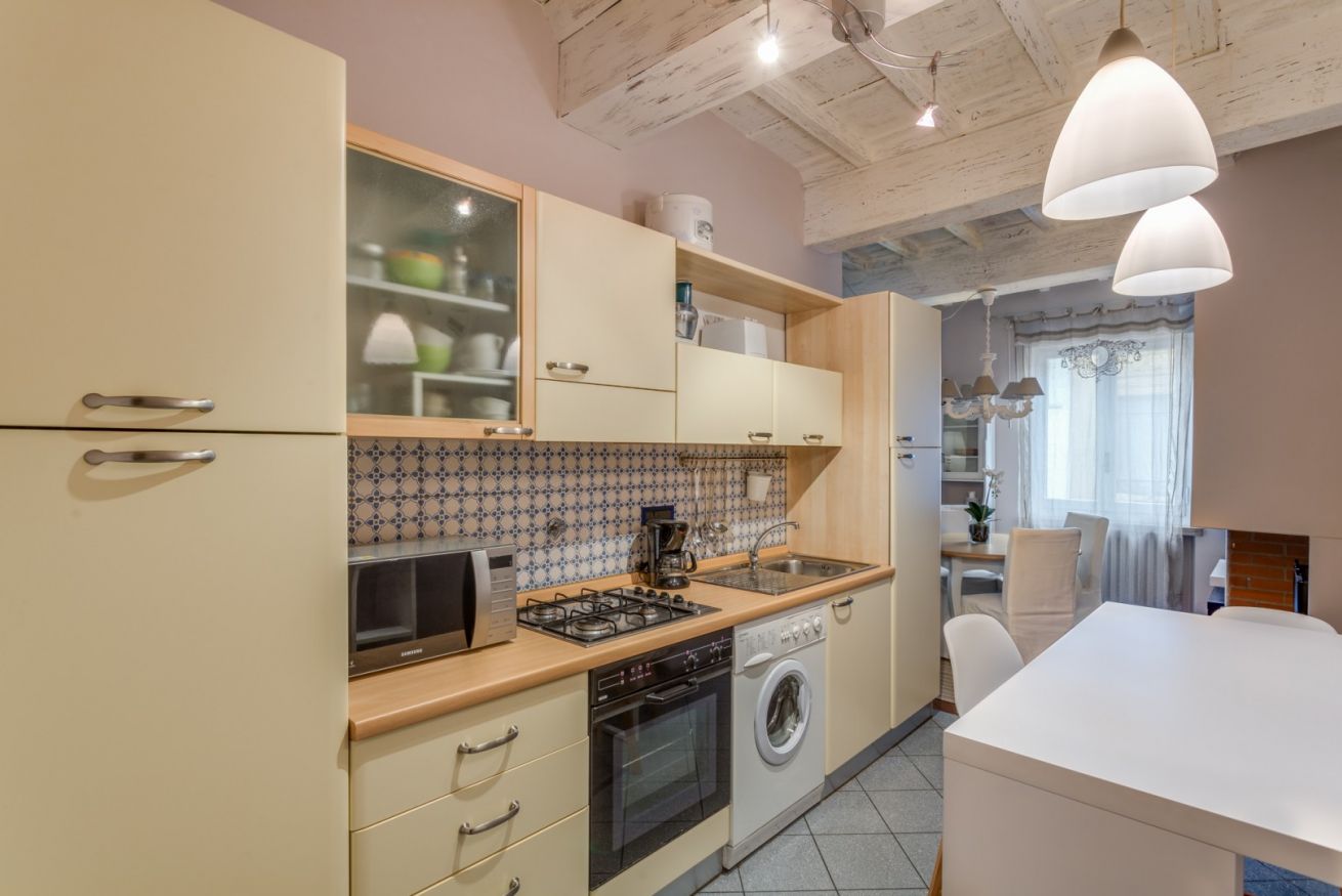 Exposed beamed ceilings throughout the apartment create a cozy, traditional Florentine atmosphere. Large windows in the living room give way to wonderful natural light. This spacious room, with sofa bed and dining table for 4 people, provides wonderful space to relax after a full day of exploring the sights of the city. A wood burning fireplace place adds to the charm of this room. Just off the living area you will find a fully equipped kitchen with additional dining for 3-4 people. The master bedroom, with Queen bed and high ceilings, offers ample storage space for clothing. The choice of furniture and lighting exudes a romantic feeling throughout the apartment.