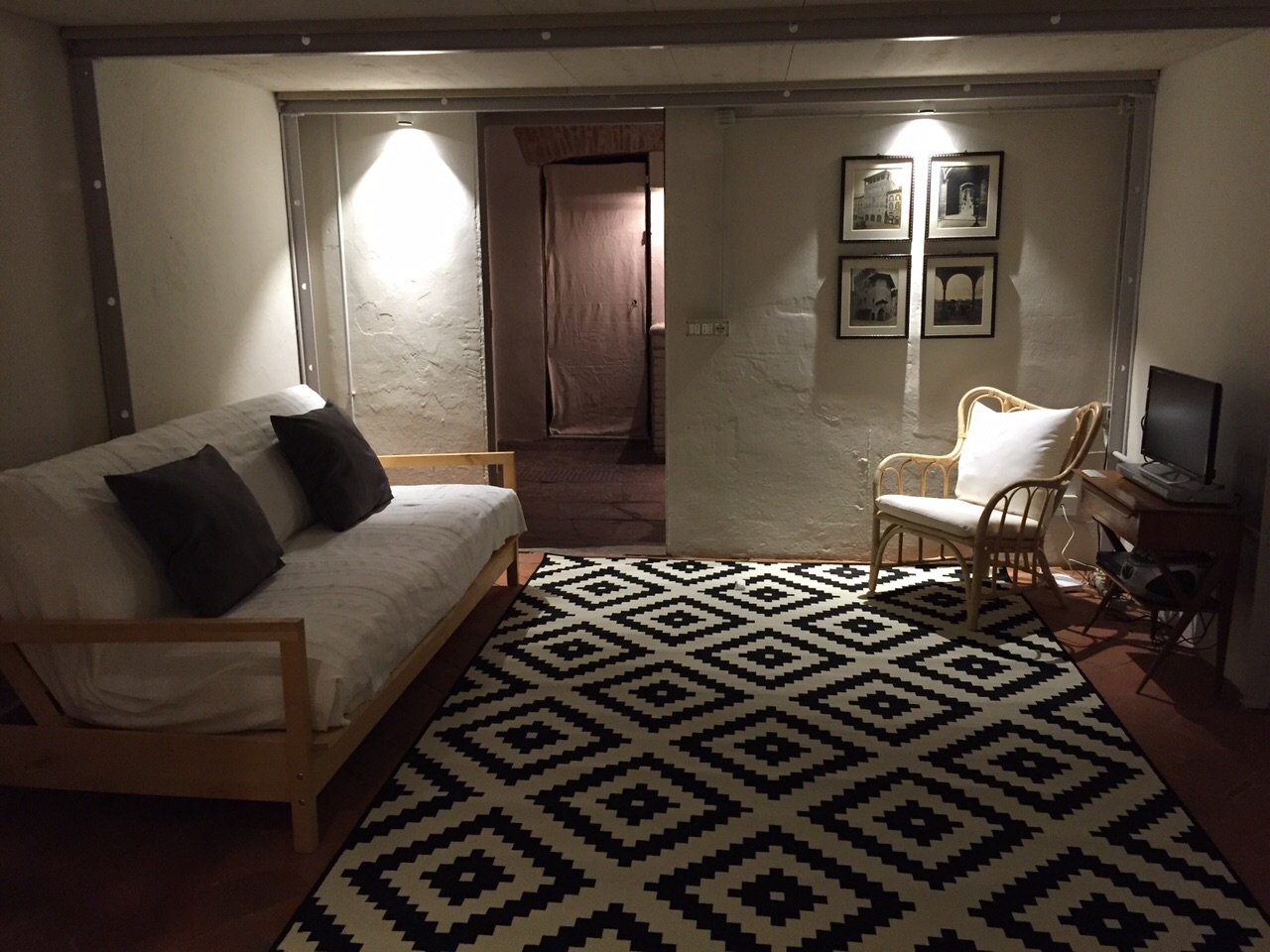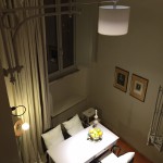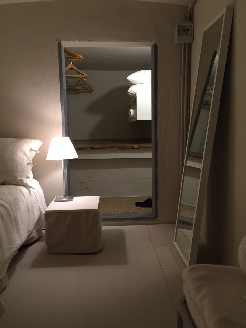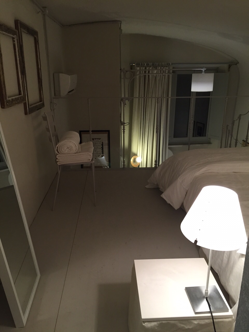 At the entrance open a large room which serves as livingroom (with double sofa bed) and as dining room . On the upper level ,through a spiral staircase, open a nice double bedroom with next a small wardrobe room . Close to the livingroom a particular fully equipped kitchenette and one bathroom with shower .