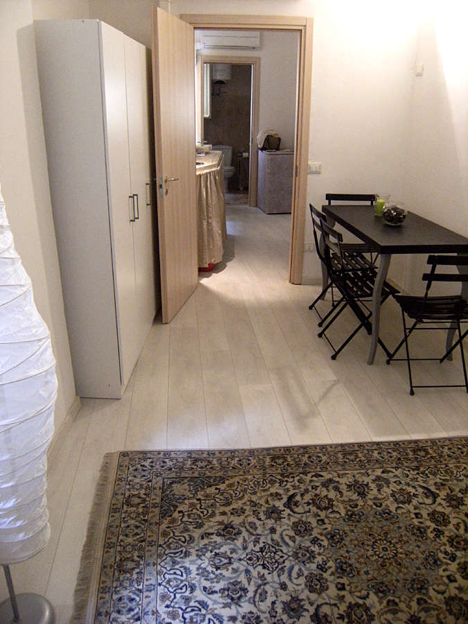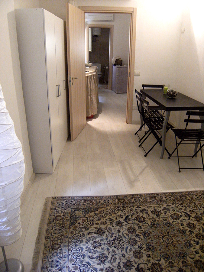 rebuilt after the second world war because of the bombing raid which devastated this part of the city . The apartment is on the 1st floor with elevator and it’s formed by an entrance, where it has been made a kitchenette, and two rooms : one of them is a large double bedroom overlooking Via Lambertesca , the other is a living room with dining table,double sofa bed and small storage . Laterally open a bathroom with shower . The apartment has been recently restored and carefully furnished and decorated .